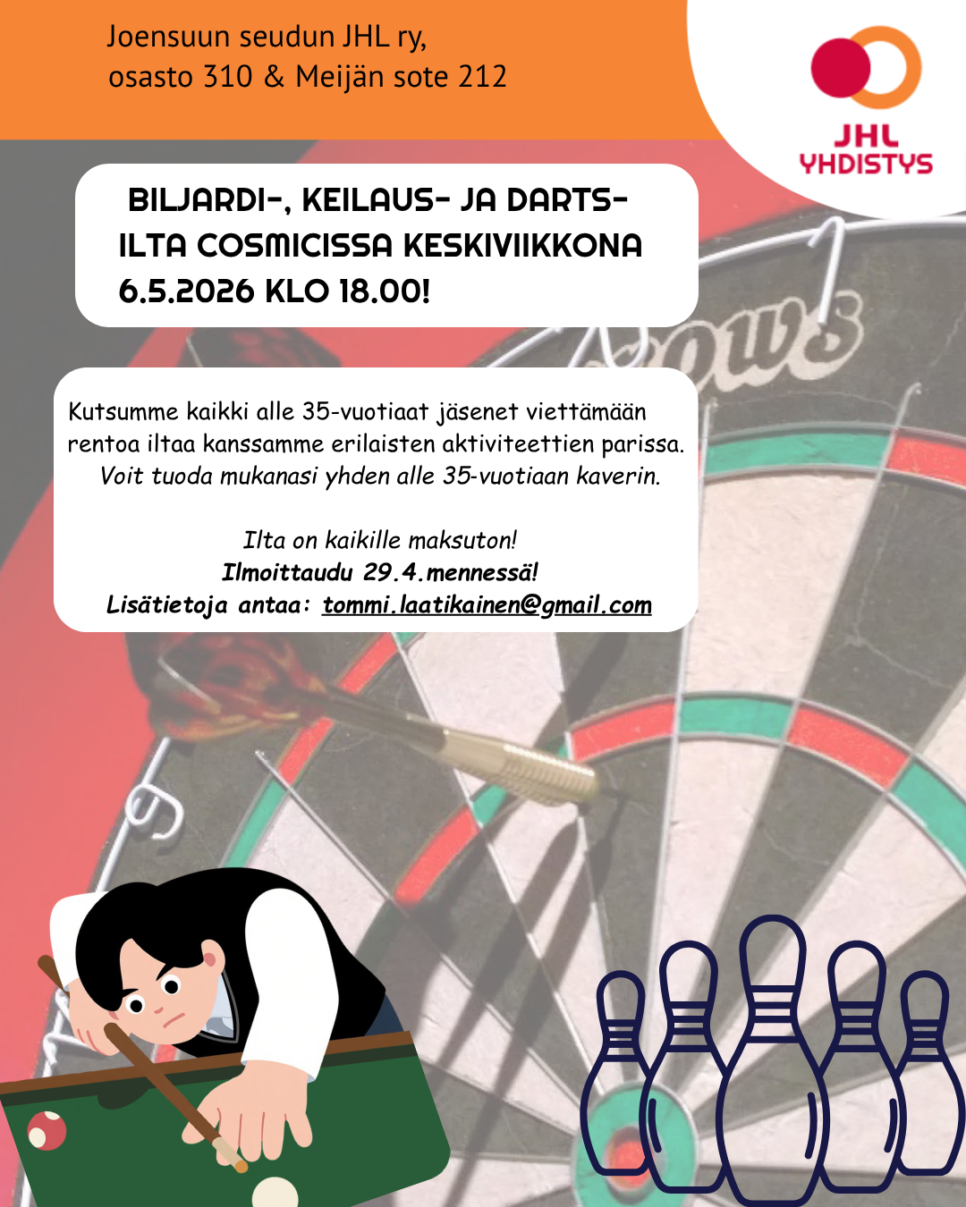 Joensuun seudun JHL ry, osasto 310 & Meijän Sote 212 kutsuvat kaikki alle 35-vuotiaat jäsenet viettämään mukavaa iltaa erilaisten aktiviteettien parissa.